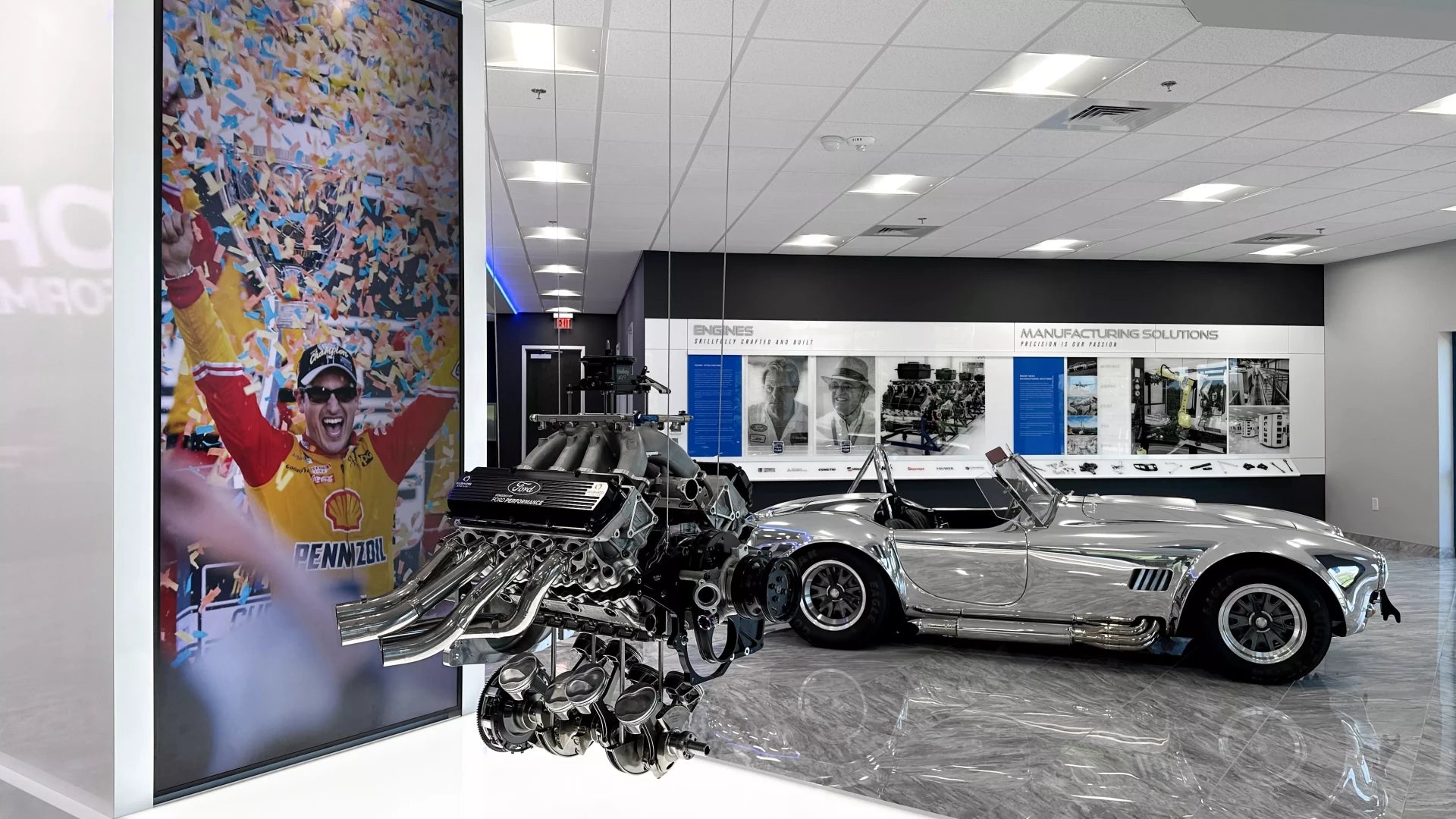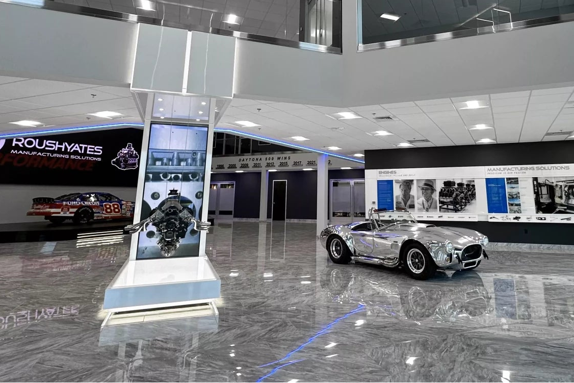 I flew to North Carolina to handle the full installation, assembling and suspending the entire exploded view on-site. Today, the FR9 display stands as the focal point of the Roush Yates entrance—an engineering story brought to life. What a great pleasure it was to work with the team at Roush Yates, and an honor to have a part in creating an amazing display of motorsport history.