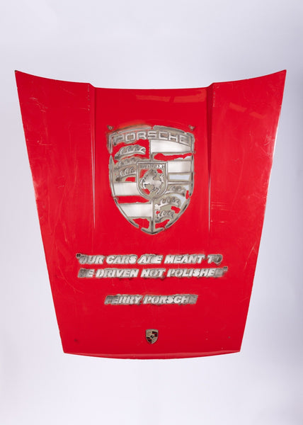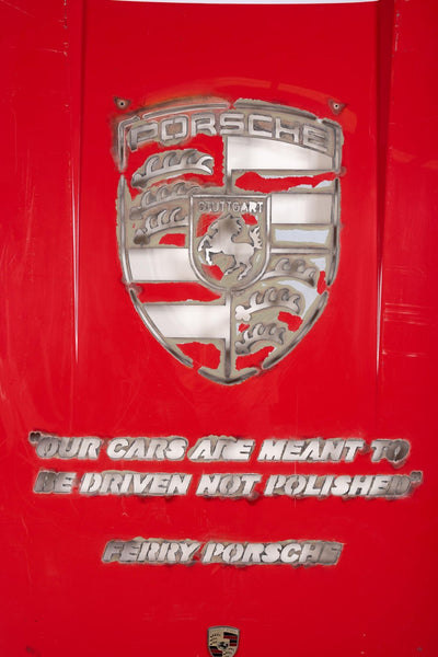 Bring Porsche heritage into your space with this handcrafted art made on a genuine Porsche 911 car hood, also including one of Ferdinand Porsche's most famous quotes.