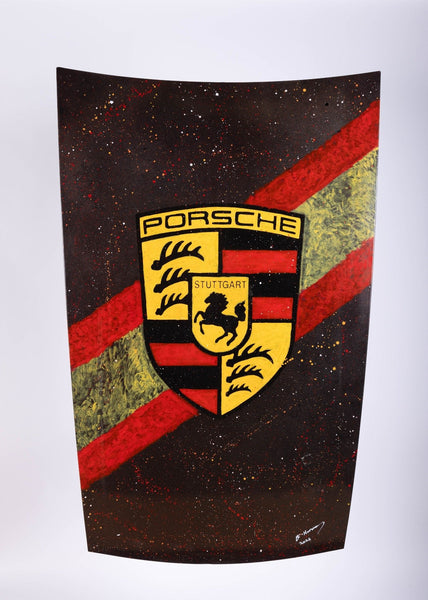 This isn't just any piece of wall art - it's a hand-painted piece with a genuine Porsche 944 hood as its canvas.